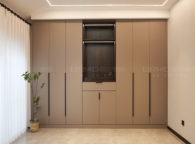 柜門選用膚感PET一門到頂設計,搭配開放格+抽屜柜