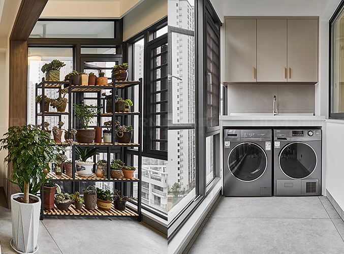 陽臺面積大,采光好,內嵌式洗衣機設計,不占空間,陽臺吊柜可以放置洗衣液等洗衣用品,
