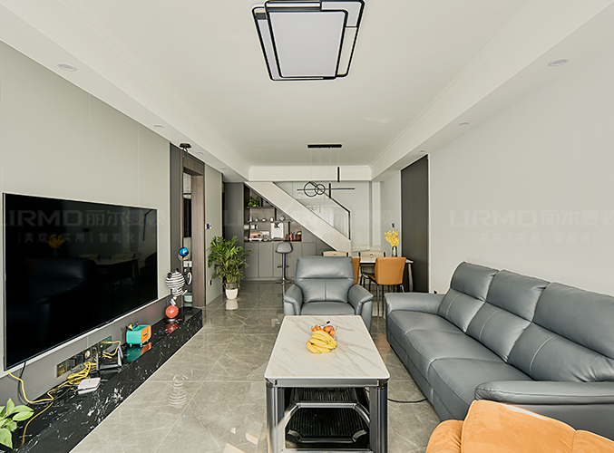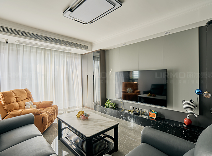 整屋通鋪瓷磚,盡顯大氣,電視背景墻采用整面墻設(shè)計(jì),整體效果不顯沉悶,