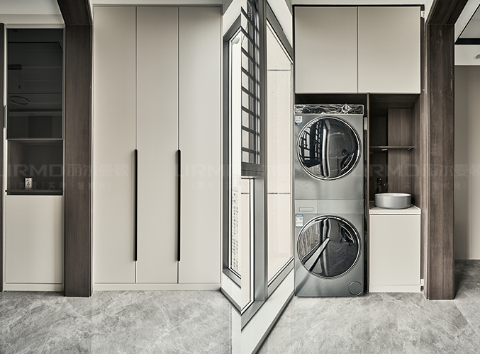 陽(yáng)臺(tái)采光好,內(nèi)嵌式洗衣機(jī)設(shè)計(jì),不占空間,一門到頂柜子設(shè)計(jì)加上洗漱柜設(shè)計(jì),盡顯大氣。