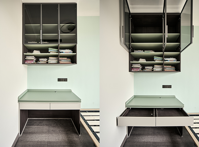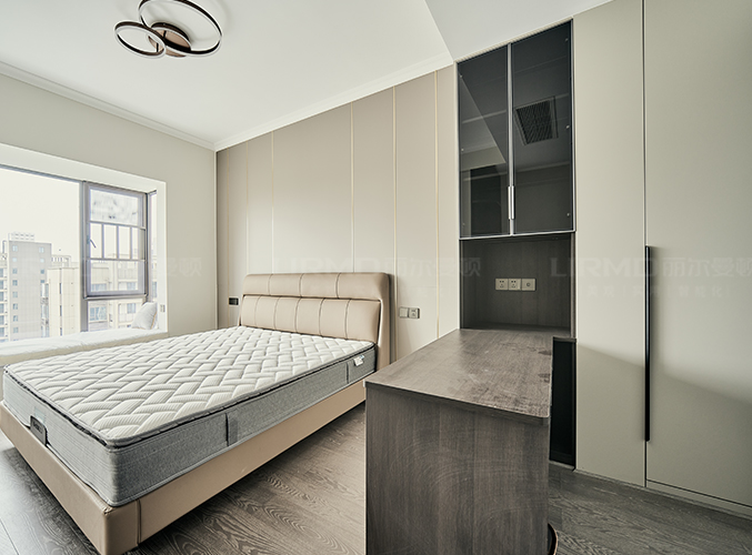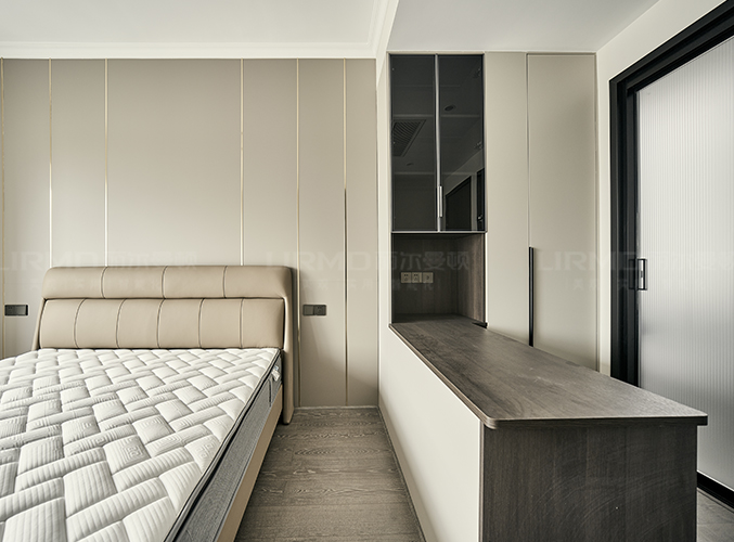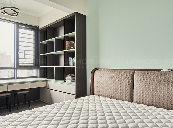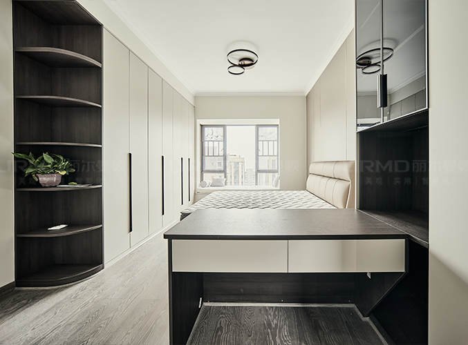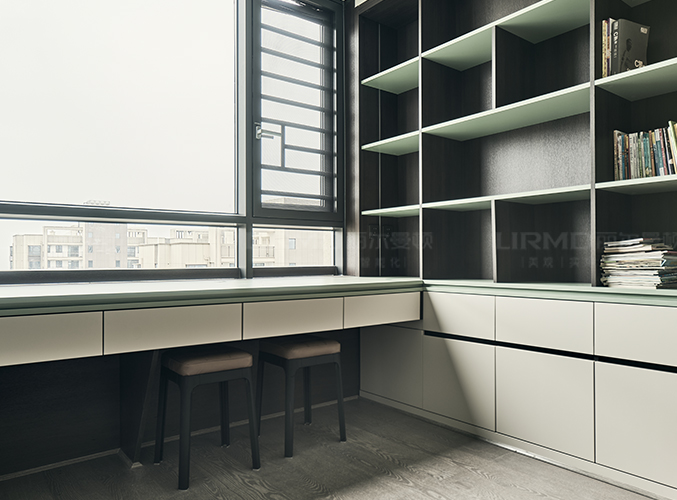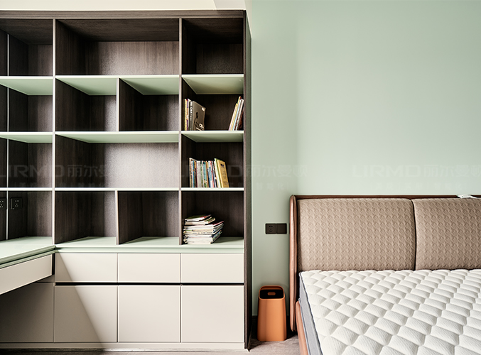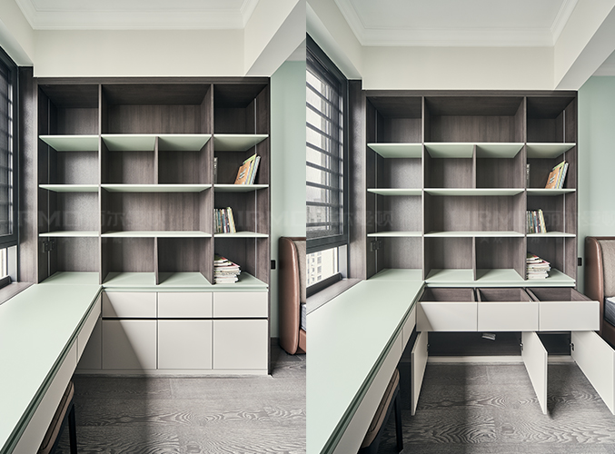 多組柜子設(shè)計(jì),實(shí)木柜體搭配PET膚感柜門,收納更方便,書柜加書桌的設(shè)計(jì),