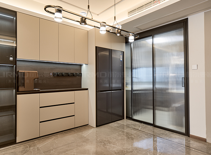 整體的墻柜很好的利用空間,收納大大的提升,內嵌式冰箱設計,不占空間,