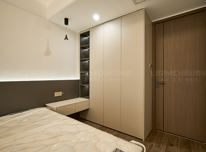 衣帽間做L型衣柜+一門到頂設計,三面柜門做落地穿衣鏡功能性十足。