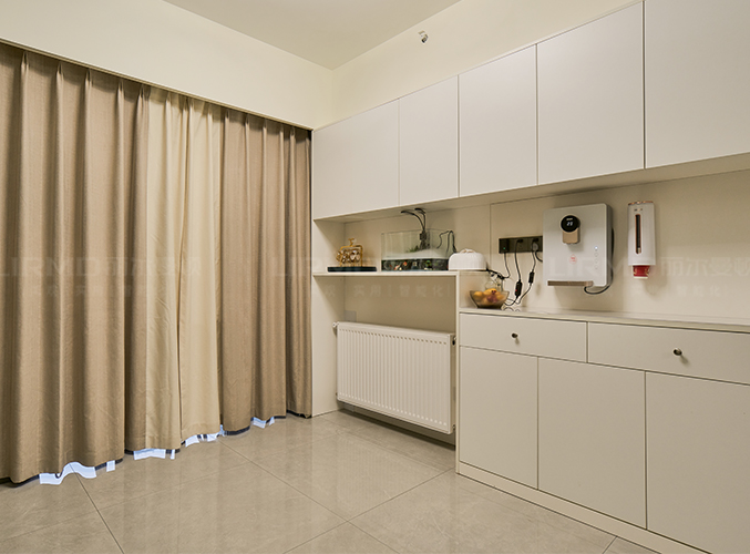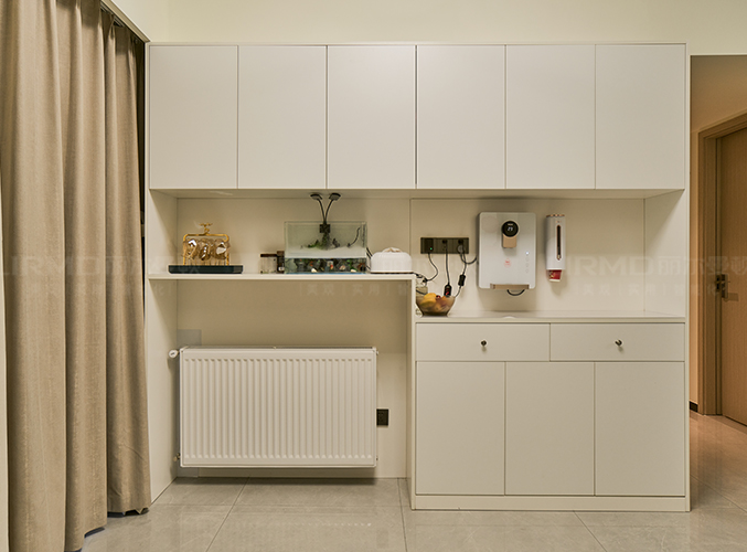 整體的墻柜很好的利用空間,收納大大的提升,整體白色與墻面統(tǒng)一,中空做飲水臺置物,