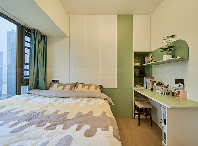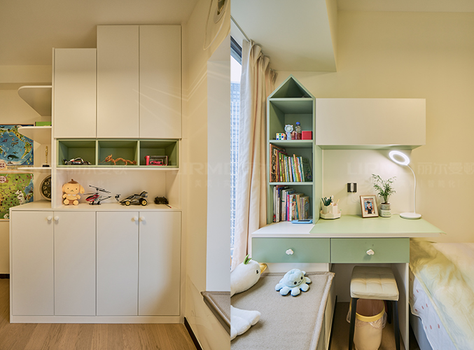 衣柜書桌一體化設(shè)計,學(xué)習(xí)辦公兩不誤,選用清新綠色+白色打造溫馨童趣空間。