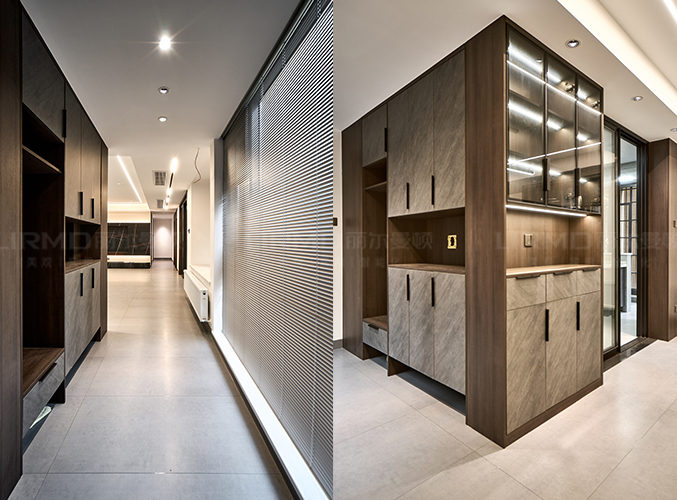 18mm厚杉木芯板,長廊兩側(cè)分別置鞋柜和儲物柜,視覺效果更好,下方懸空設計,好放置鞋子,