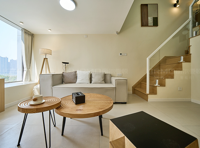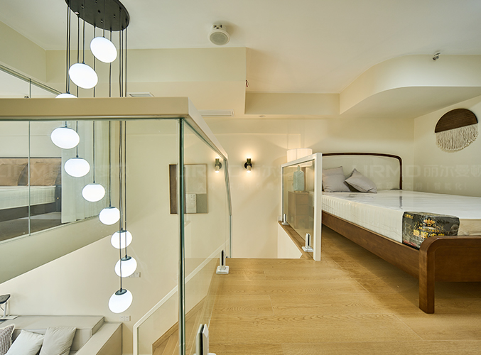 全木地板樓梯設計,安裝簡約風球型吊燈,體現復古藝術感。