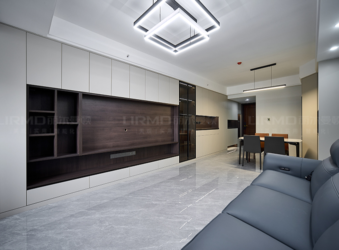 18mm厚杉木芯板,入戶鞋柜+餐邊柜的設計,大大提升了收納空間,鞋柜下方懸空設計,