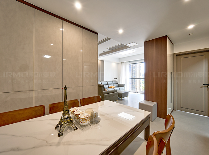 整屋通鋪瓷磚,盡顯大氣,電視背景墻采用整面墻設計,整體效果不顯沉悶,