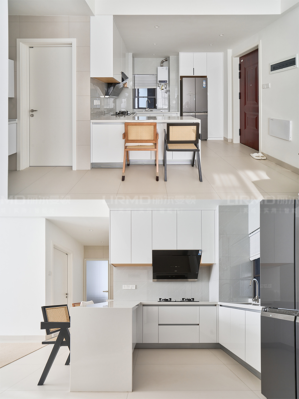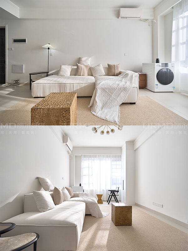 所以,設(shè)計(jì)師在軟裝上,融合了少量深色和藤編材質(zhì),提升整個(gè)空間的質(zhì)感和格調(diào)。