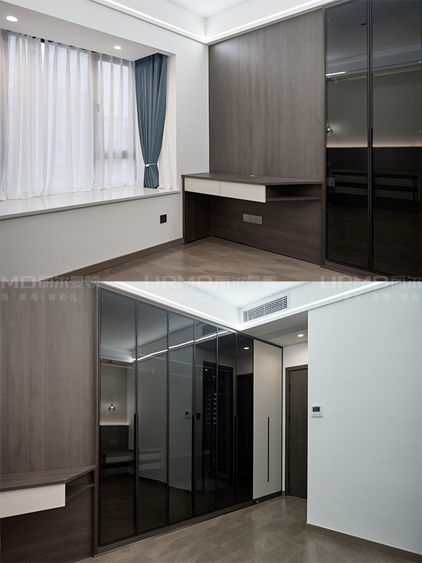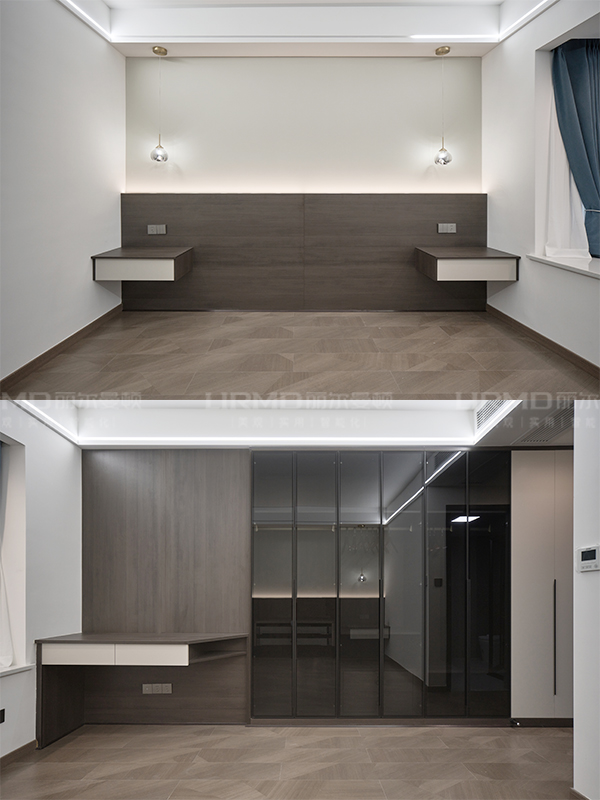 書柜收納柜、懸浮效果書桌、主臥衣柜、主臥梳妝臺(tái)、兩個(gè)主臥挑空床頭柜、次臥衣柜、