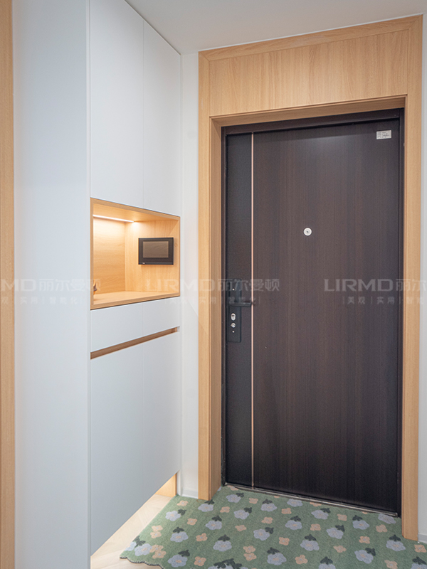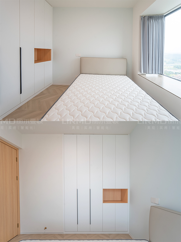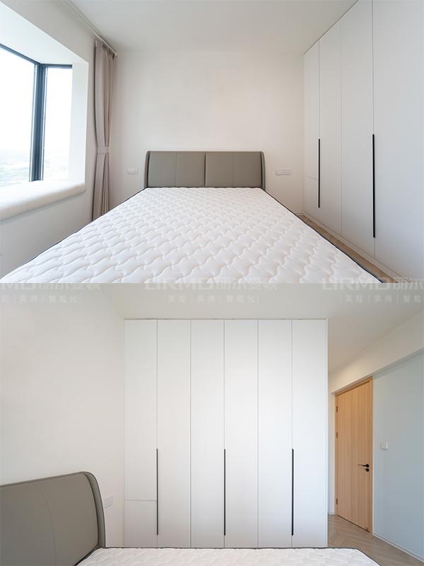 高端全屋定制:柜體板材為十環認證的萬象天冠18mm厚杉木芯板、柜門是歐松板雙飾面門、奧地利進口百隆五金。