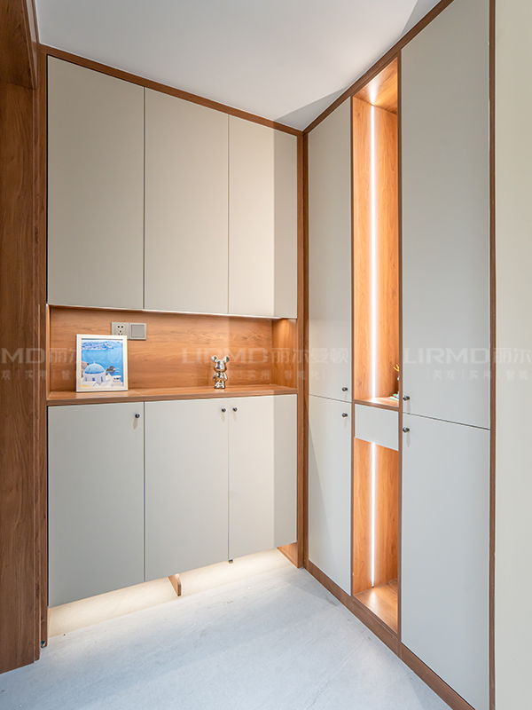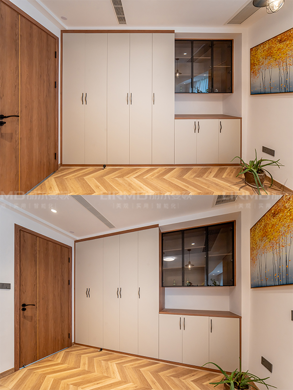 全屋定制:使用萬象天冠品牌18厚環保ENF級杉木芯板柜體、山東豐源仙檀山歐松板大薄片膚感柜門、