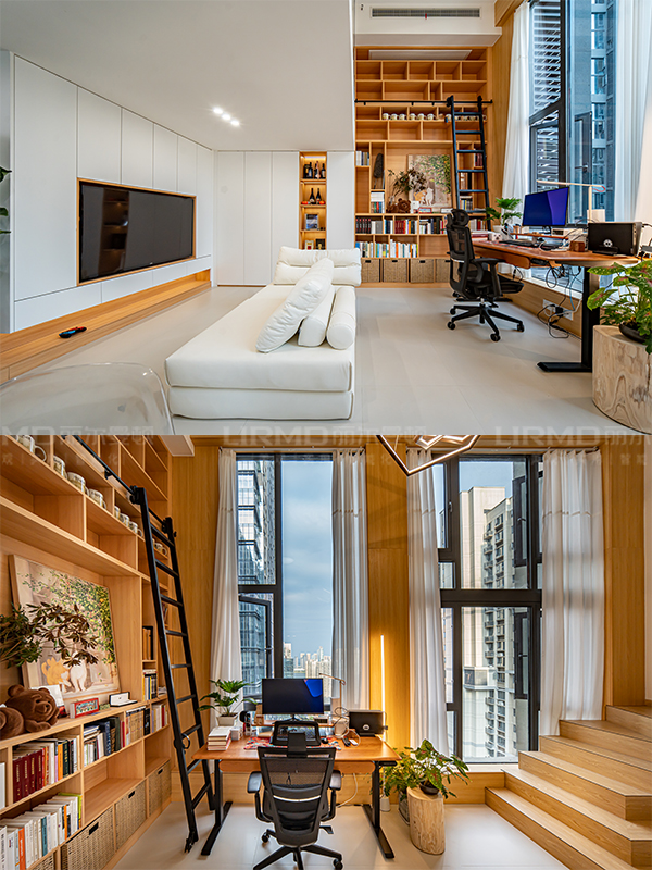 復式客廳做整墻書架,坐這里辦公簡直是我的夢中情房