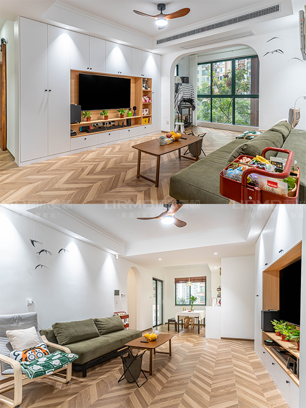 滿墻電視背景柜、獨立式書房、全屋通鋪魚骨紋瓷磚至陽臺,搭配復古吊燈