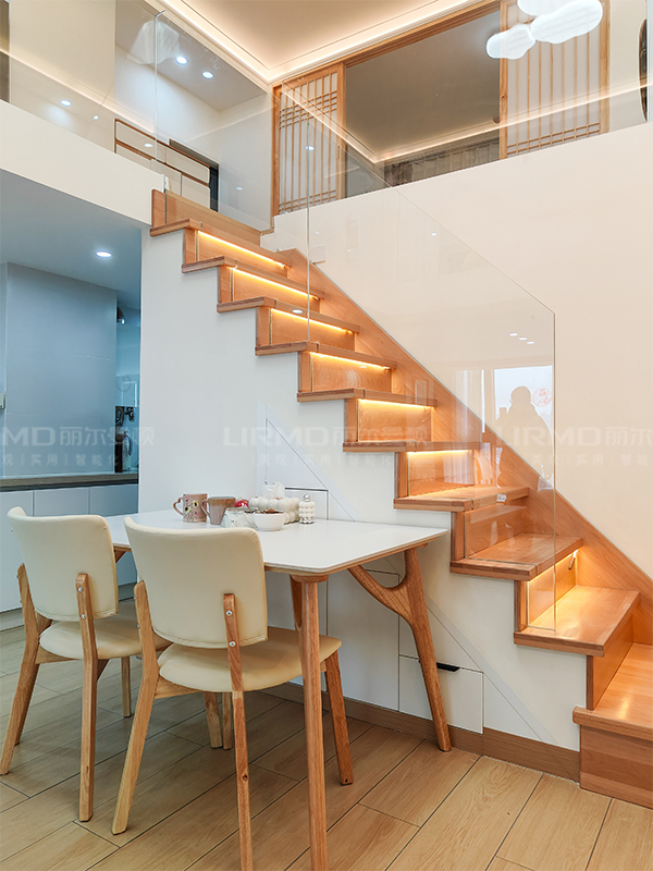原木護墻板讓空間更溫馨,挑空區(qū)域加石膏線燈,讓空間更靈動