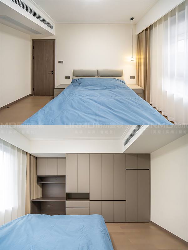 L 型懸浮床頭柜,右邊儲物柜,即使是小空間也能打造的如此溫馨實用