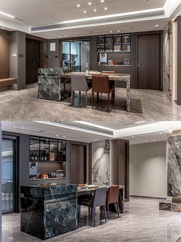 客廳餐廳茶吧一體設計,提升空間通透性與開放度,讓空間更具和諧美感