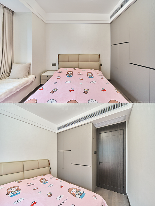 墻板運用同色門板上墻穿插大理石紋路墻板,與暖色燈光相結合,讓沉穩的空間也不失溫馨