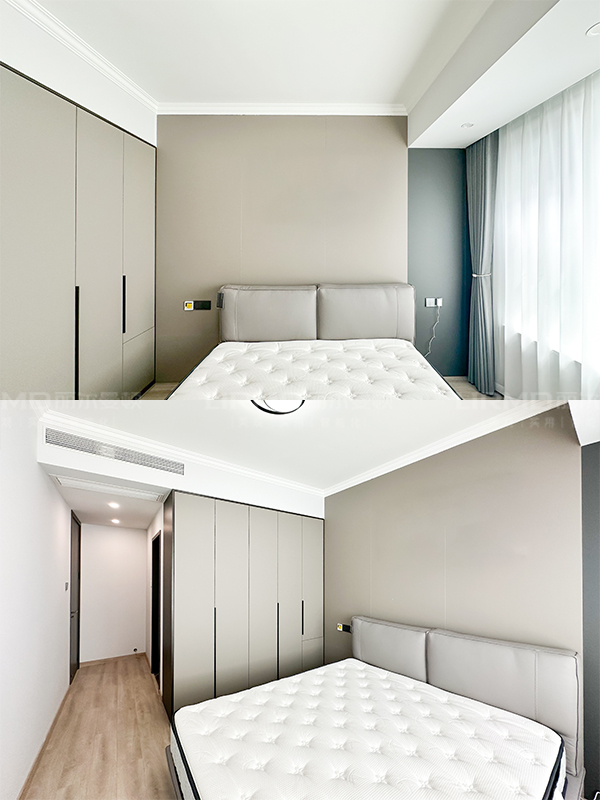 主臥床假懸浮式安裝人體感應(yīng)燈帶,飄窗一個顏色的墻板和諧統(tǒng)一