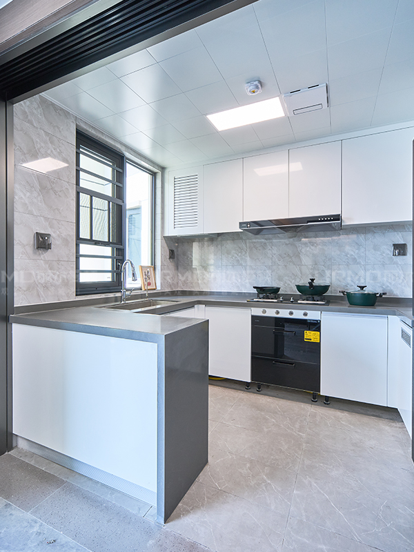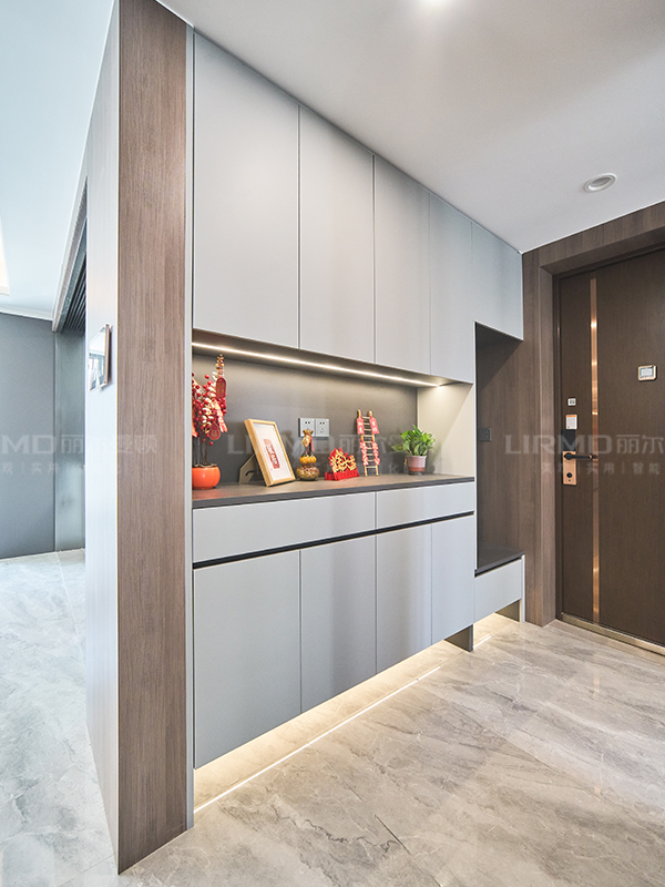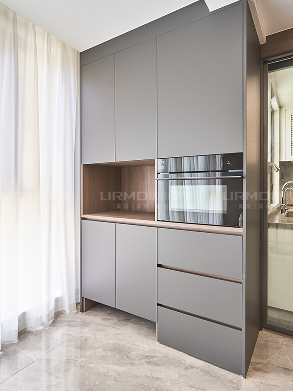 整個客餐廳以及陽臺等公共區(qū)域全部做了免拉手設計,利用免拉手的線條分割柜門,簡單又不失細節(jié),非常顯高級感