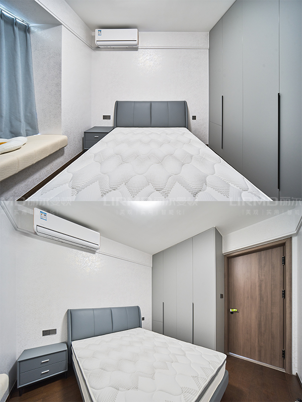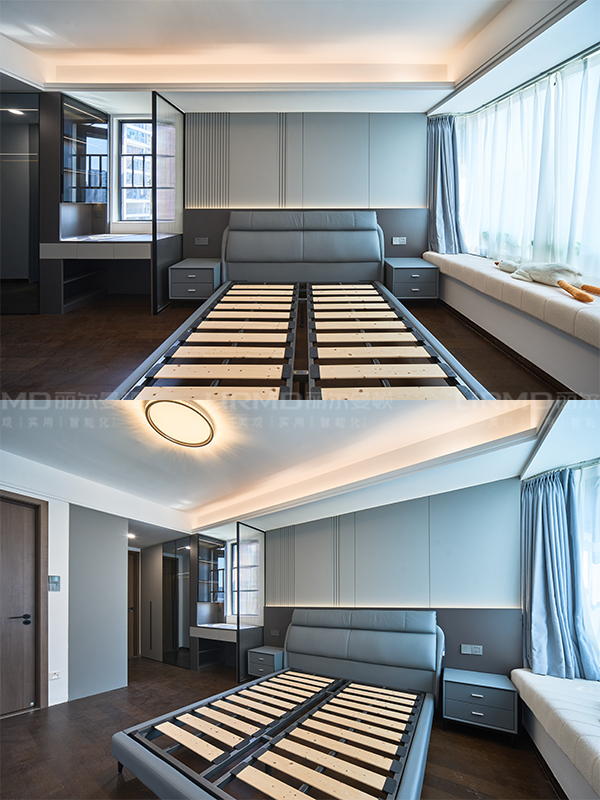 全房做了隱形門結合護墻板,電視背景做了巖板設計,電視內嵌,條柜做灰色調色搭配木紋色,輕奢感滿滿
