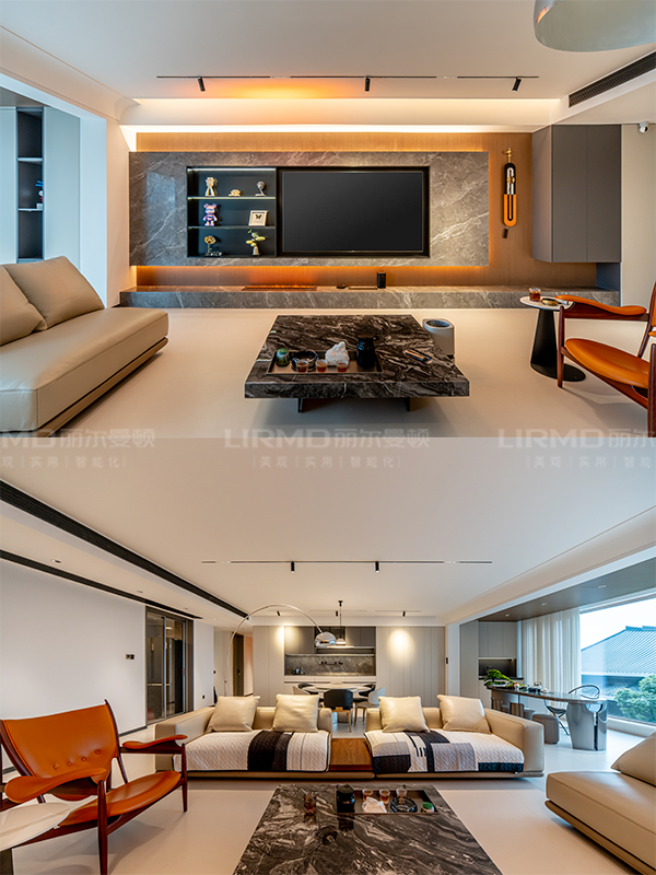 客餐廳空間開闊大氣,木飾面巖板背景墻搭配無拉手柜門又美觀又實用
