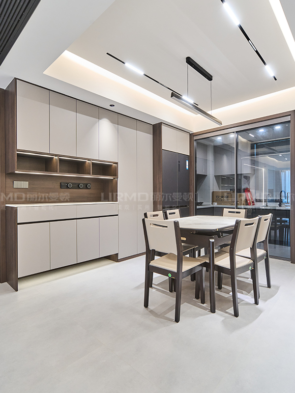 客廳收納柜做免拉手設計,搭配隱藏式燈帶,視覺上更顯大氣