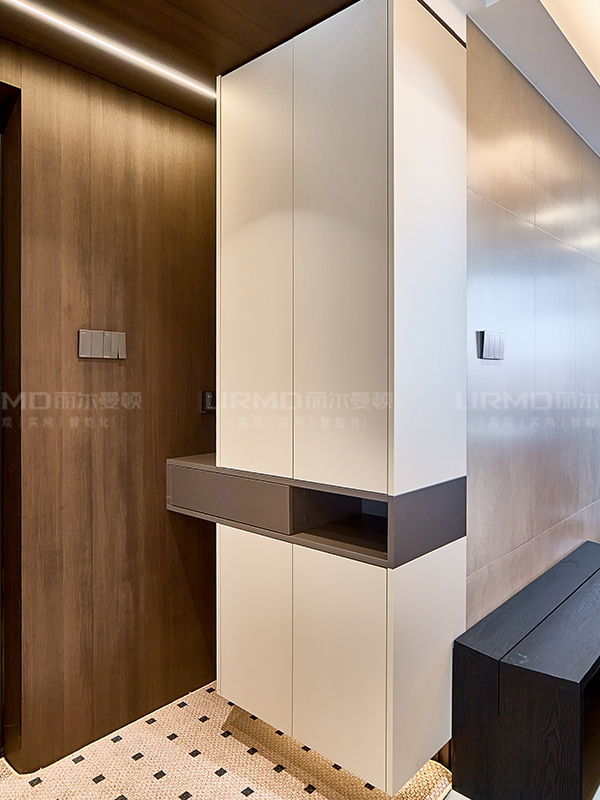 玄關位置采用半圍合木飾面,連接餐廳空間,左側(cè)做懸空鞋柜,充當玄關柜。