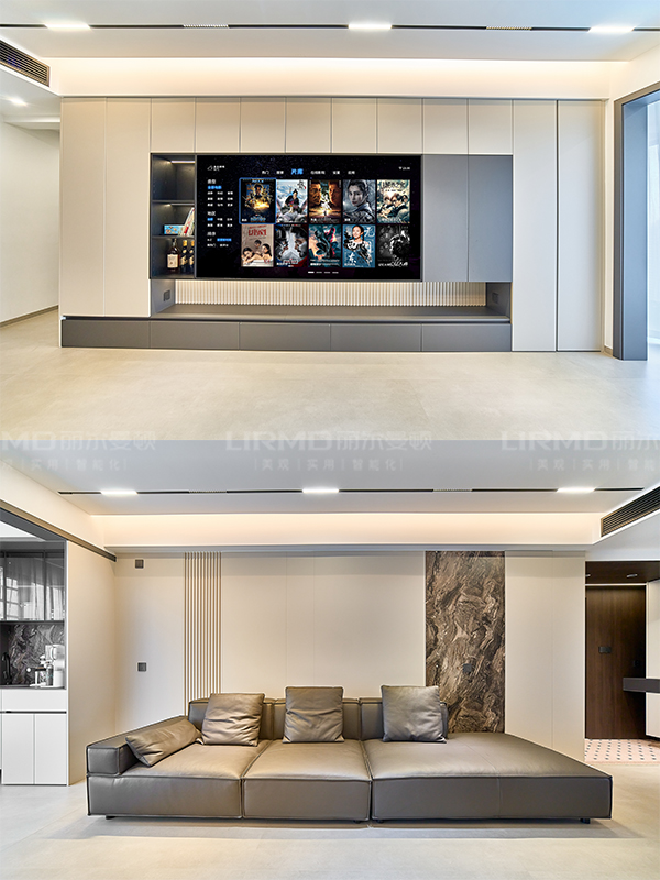 電箱位做隱形門,與沙發(fā)背景墻形成一體式設計,美觀又大氣。
