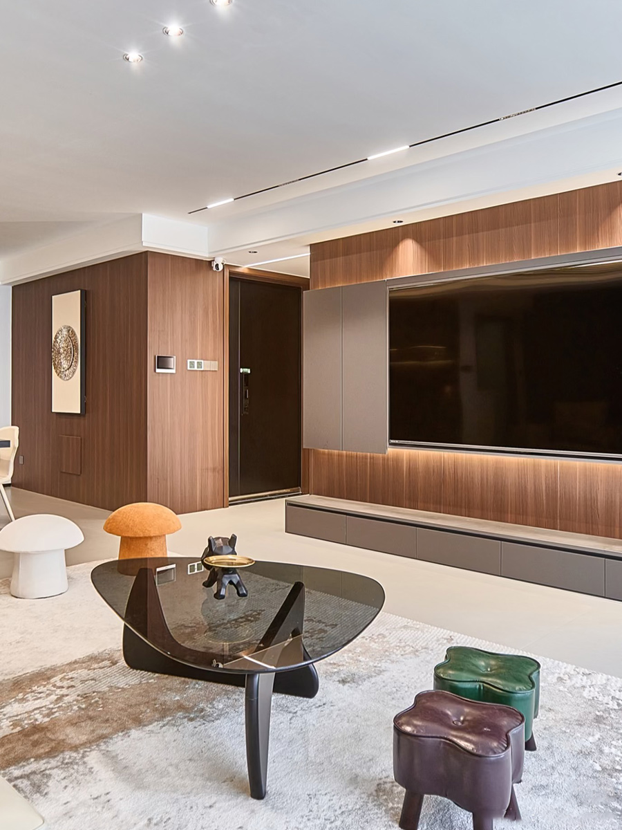 整體采用暖棕意式極簡搭配,搭配巖板、格柵做沙發背景墻。