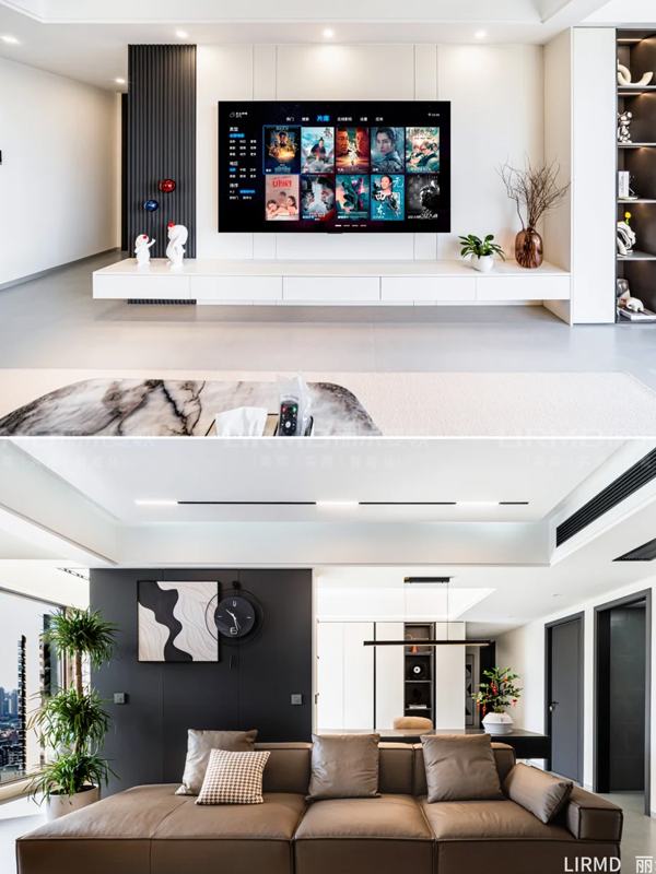 無主燈設(shè)計,氛圍感拉滿!玄關(guān)柜轉(zhuǎn)角與電視柜銜接,采用懸浮式設(shè)計,延伸空間感