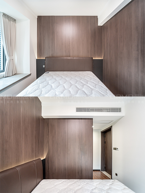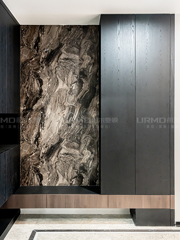 全屋門、墻、柜采用同款煙熏尤加利木紋飾面,避免色差,提升視覺延伸感