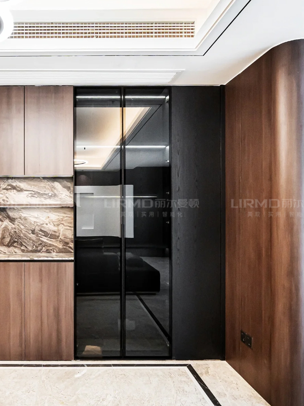 全房門墻柜一體化,圓弧設計,通體拉手等設計無不體現出麗爾曼頓10.0高定奢配工藝的實力。