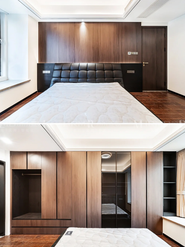 主臥擯棄轉交衣帽間,采取床尾柜更加大氣,背景墻也有增加氛圍感的作用。