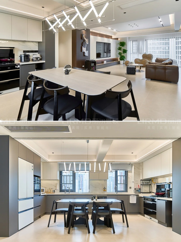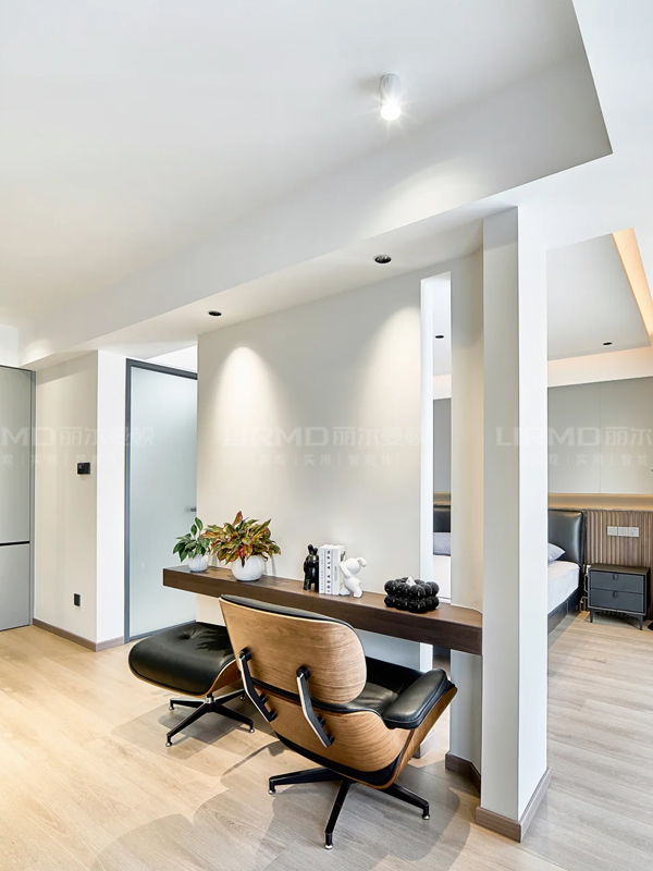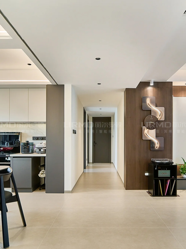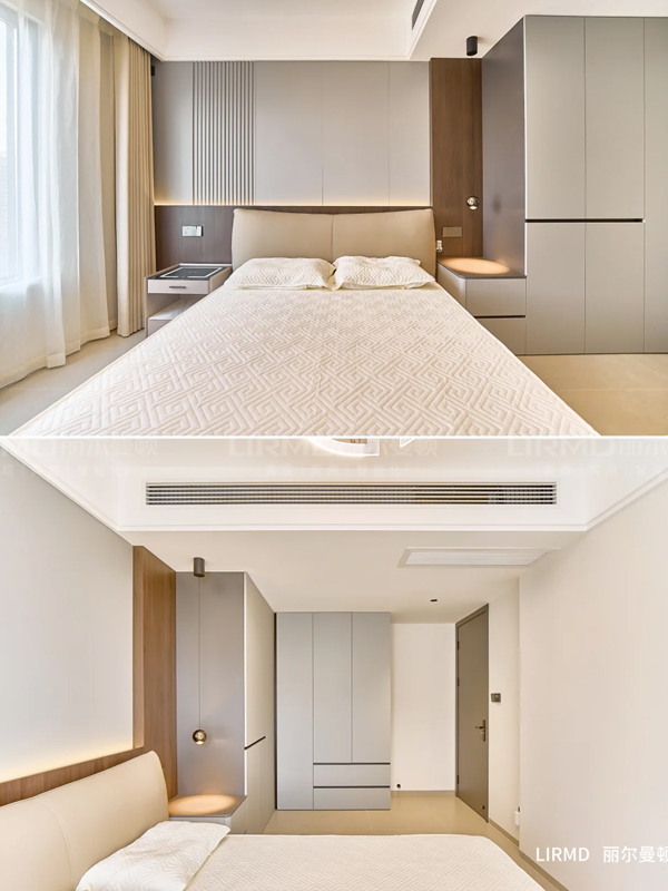 隱形設計:所有門套、踢腳線做極簡收口,連空調風口都定制同色格柵,強迫癥狂喜