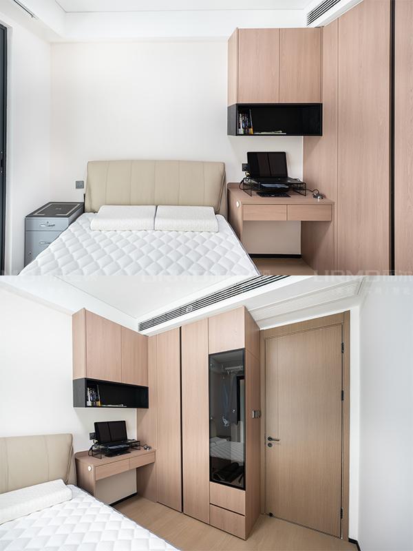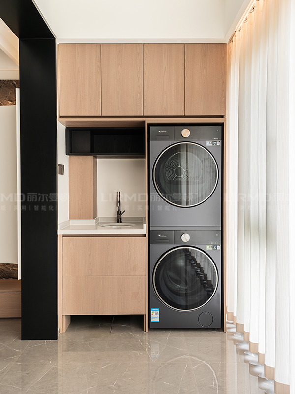 整體配色是黑白木色,搭配暖色漆,強調極致收納和空間放大